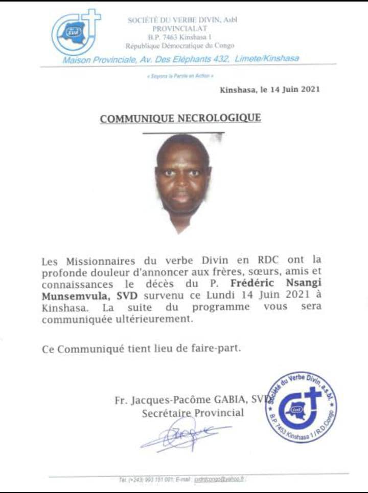 C’est avec consternation que les Missionnaires du Verbe Divin en République Démocratique du Congo annoncent le décès du P. Frédéric Nsangi, SVD! RIP